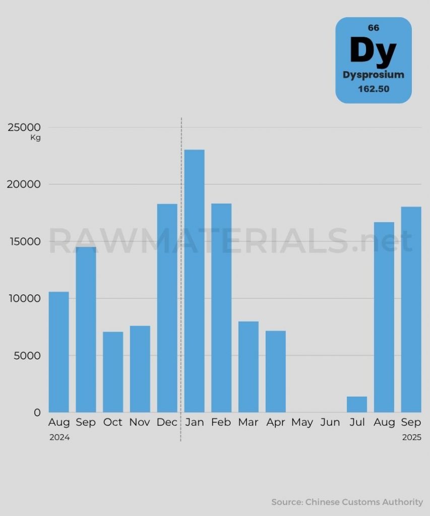 A total of 18,043 kilograms of dysprosium were exported in September, the highest monthly volume since February, with more than 17,000 kilograms going to South Korea. Minor amounts went to Estonia, Portugal, and Thailand.