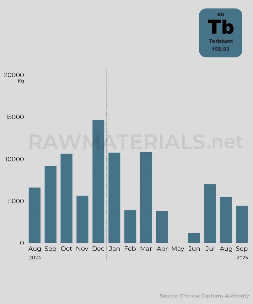 China’s latest customs figures show another strong month for dysprosium exports, while terbium shipments softened slightly compared to August.