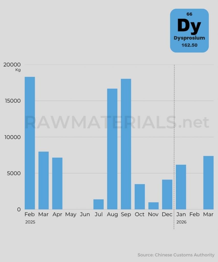 After no dysprosium was exported from China in February, the latest customs data for March show an increase to 7,386 kilograms, moving back toward last year’s level. The majority of the material was shipped to South Korea, while Portugal received a smaller volume.