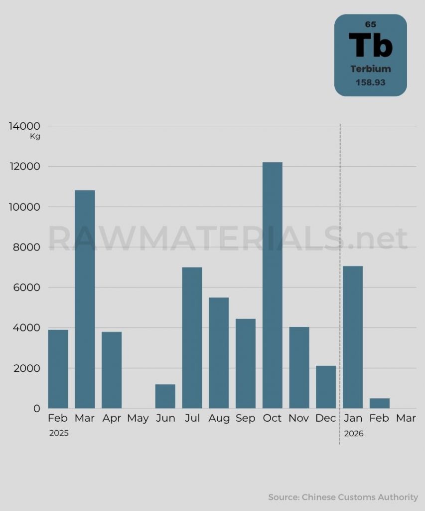 For terbium, the decline seen in February continues: only three kilograms were exported, all of which went to Australia. Since April 2025, China has imposed strict export controls on dysprosium, terbium, and other rare earth elements. For comparison, nearly 11 tonnes of terbium were shipped in March 2025, shortly before the measures took effect.