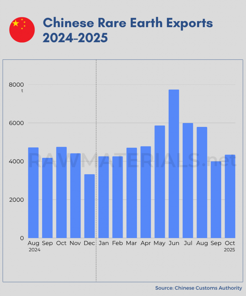 Data from the General Administration of Customs showed that China exported 4,345.5 metric tons of rare earths in October, up 8.7% from 4,000 tons in September. The world’s leading supplier of minerals critical for electric vehicles, wind turbines, and advanced electronics had seen exports fall sharply through the summer, following the introduction of expanded export controls in April