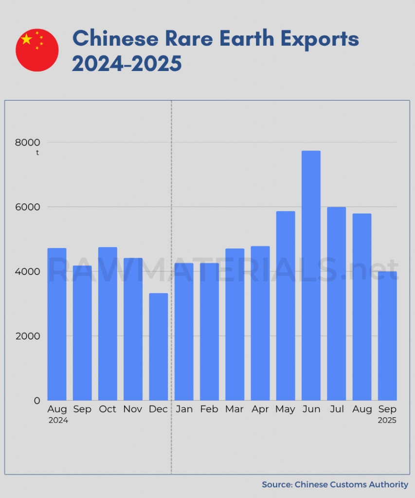 China’s exports of rare earths fell sharply again in September, dropping to 4,000 tons. Compared to August, this represents a 31 percent decline, Reuters reported, citing the country’s customs data. September marks the third consecutive month of falling exports following a peak in June.