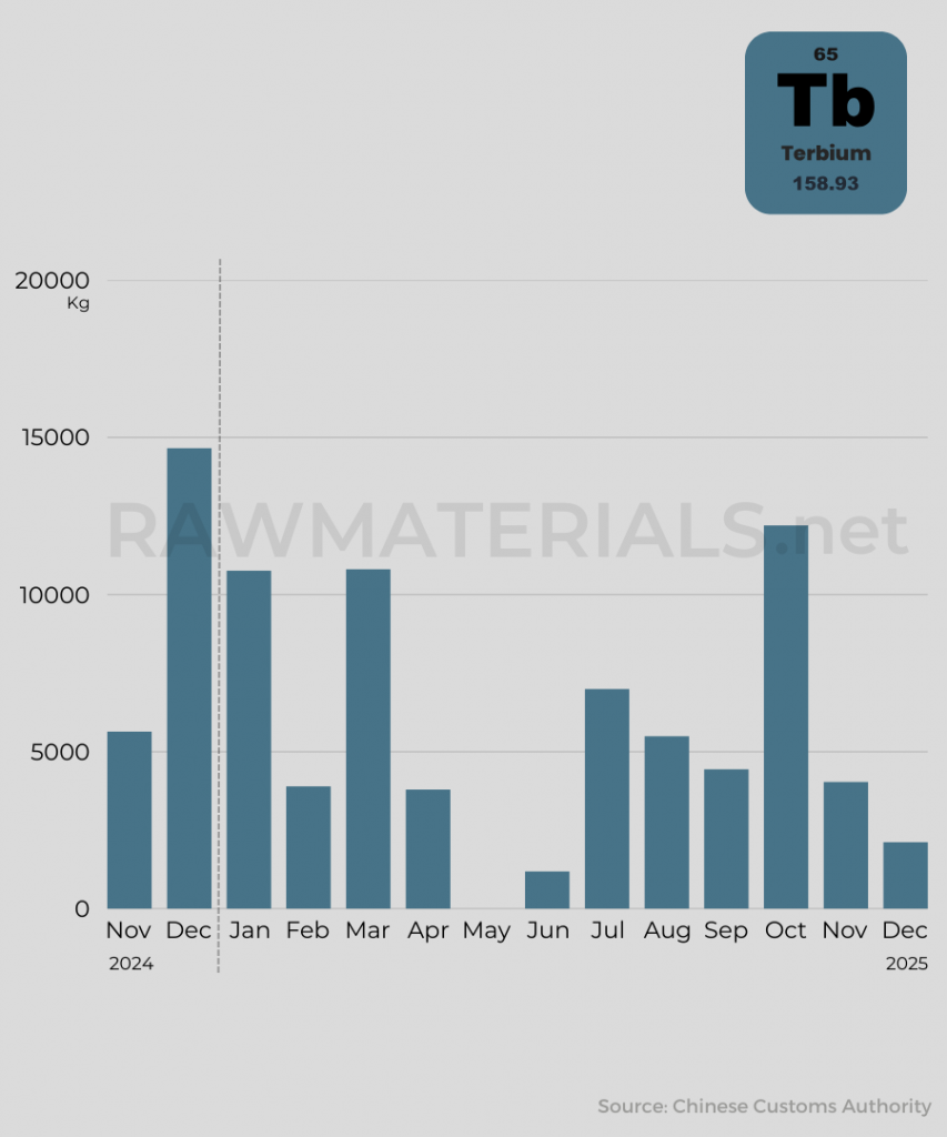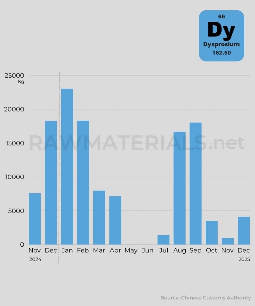 New data from China’s customs authorities show that exports of dysprosium rose markedly in December. A total of 4,120 kilograms were shipped abroad, compared with only 995 kilograms in the previous month. Japan was the leading destination, followed by South Korea and Malaysia.