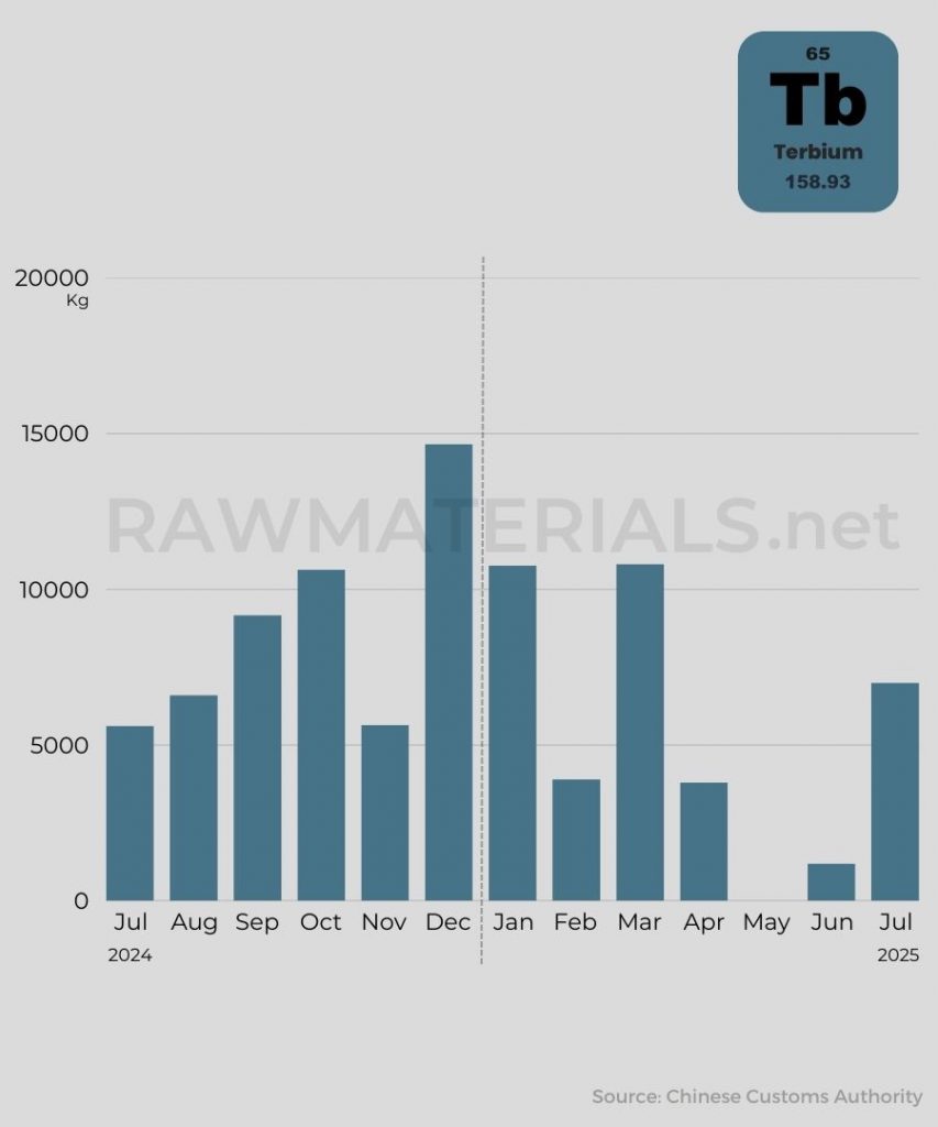 China is resuming exports of dysprosium and terbium. However, the number of destinations is dwindling. According to new data from Chinese customs authorities, the country shipped 1,400 kilograms of dysprosium and 7,000 kilograms of terbium in July. All dysprosium exports went to South Korea, while terbium was split almost equally between South Korea and Japan. In comparison, in the same period last year, China exported terbium to a total of nine countries.